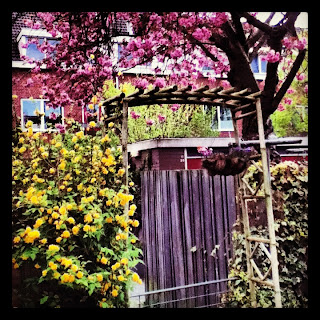I have been cleaning up the garden today. The Japanese Cherry Blossom tree has now gotten rid of her pink blossoms, all the little pink petals were lying on my garden tiles. There is another pink tree in my garden: a Salix Integra 'Flamingo'. I love the combination of pink and green colours!